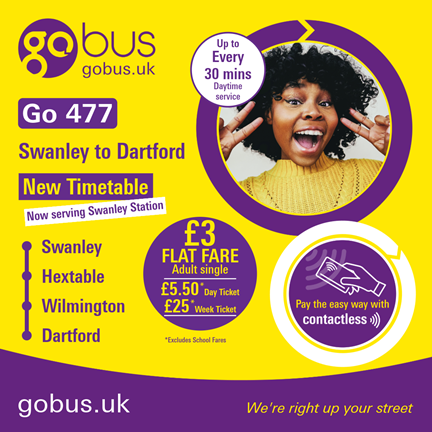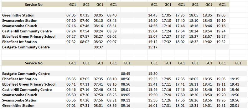 A new Monday to Friday timetable will be introduced on route GC1. At schooltimes, the route will now extend from Ebbsfleet Station to Eastgate Community Centre to service Springhead Primary School