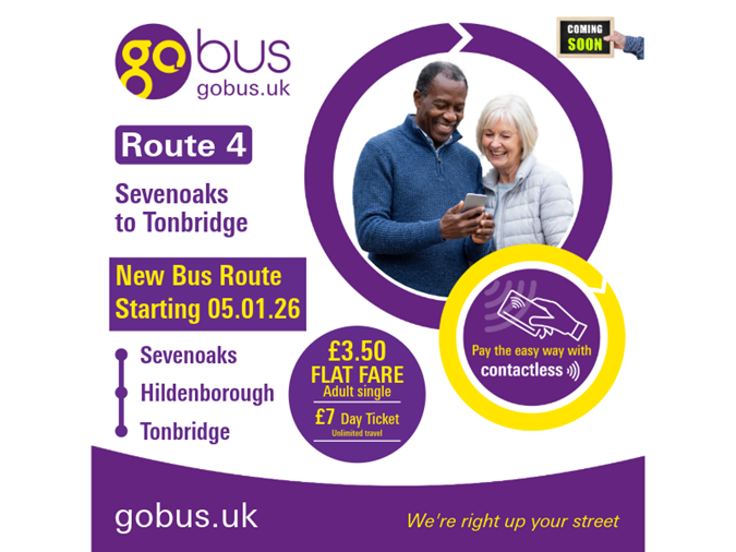We are introducing a new service, Route 4 between Sevenoaks and Tonbridge. The new route route will run from Sevenoaks via Riverhill and Hildenborough to Tonbridge.