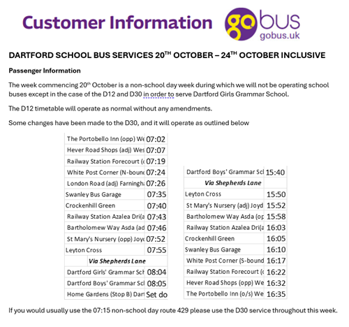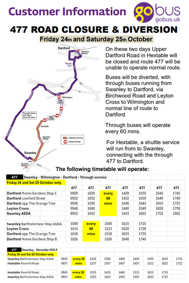 The route currently numbered D12 between Swanley and the Wilmington and Dartford Schools will be re-numbered 477s after Sunday 27 October.